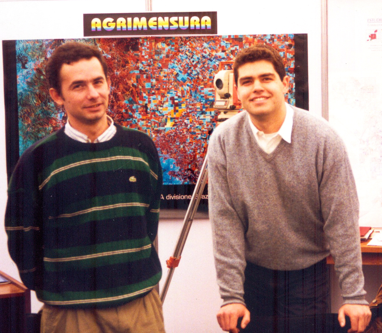 Tercero; en la foto se lo observa a Mario Piumetto , integrante en aquellos años de Ciampagna y Asociados (GDSIG) y Julio Sappia. También, a la izquierda podemos ver un mapa digital de la Ciudad de Córdoba -uno de los primeros- y una propaganda junto a la caja del software de MicroGIS (ver MicroGIS).