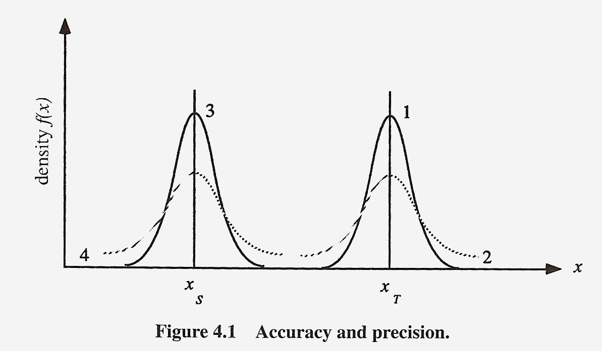 La exactitud refiere al valor cercano de las observaciones ( o de cantidades derivadas de las observaciones) en torno al valor verdadero. La precisión refiere al valor cercano de las observaciones ( o cantidades derivadas desde el conjunto de observaciones repetidas) en torno al valor de la media simple. La figura 4.1 (copiada a continuación) muestra cuatro funciones de densidad que representan cuatro diferentes procesos de medición de la misma cantidad. Las curvas 1 y 2 son simétricas con respecto al valor verdadero Xt. Estas mediciones tienen una alta exactitud, porque la media simple coincide o es muy cercana al valor verdadero. Así mismo, las formas de ambas curvas son bien diferentes. La curva uno es alta y fina, mientras que la curva 2 es corta y amplia. Las observaciones del proceso 1 están agrupadas y cercanas alrededor de la media (el valor verdadero), mientras que el area de distribución de las observaciones alrededor de la media es mas amplia para el proceso 2 que la del proceso 1. Significa que el proceso 1 es mas preciso que el proceso 2; sin embargo, ambos procesos son igualmente exactos.