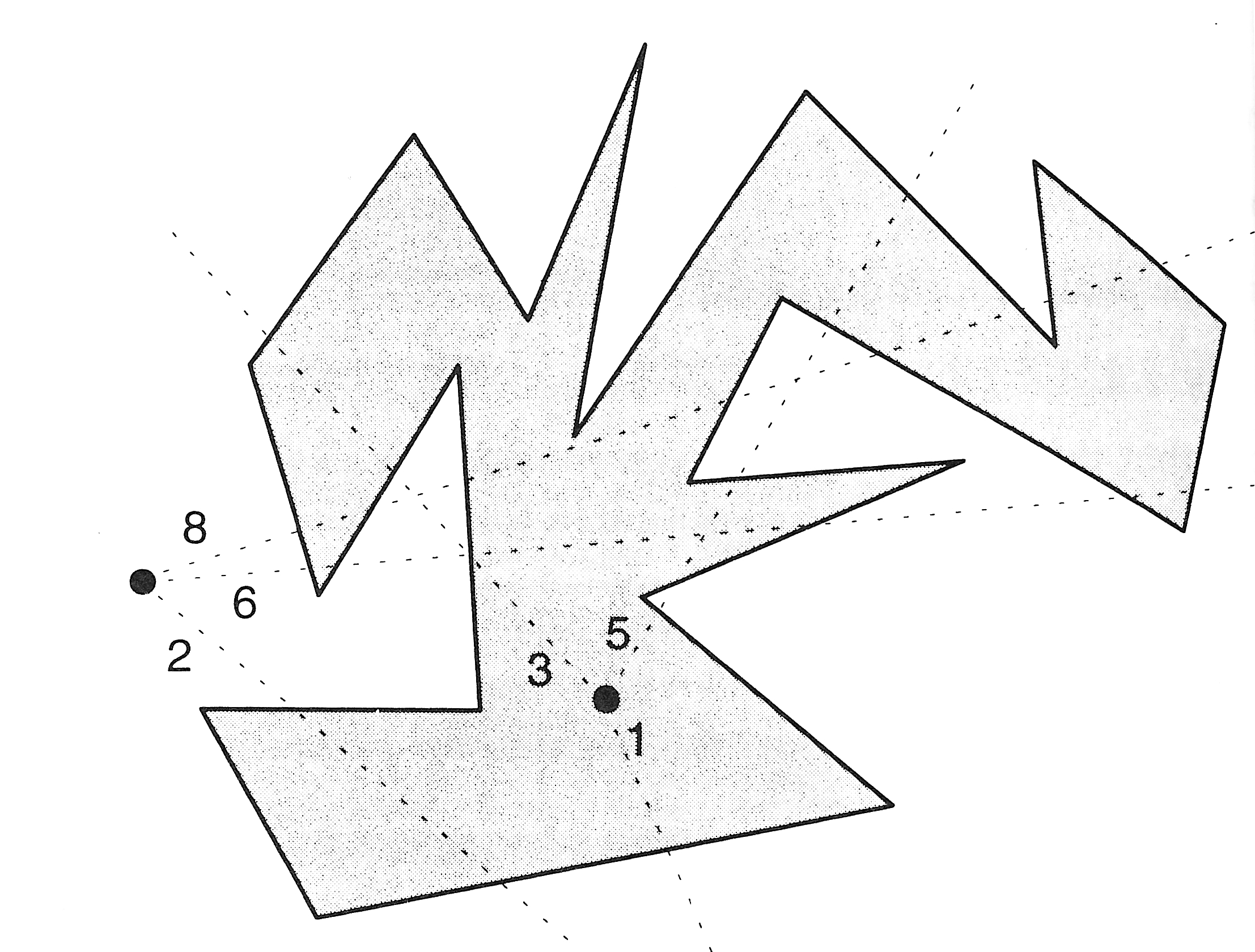 La solución consiste en dibujar semi-líneas (o rayos) que pasen por P y contar el número de veces que el rayo intercepta con el polígono. Si el número de veces es impar, entonces el punto está dentro del polígono. Si el número es par, entonces el punto está fuera. Ver la figura siguiente.