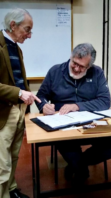 La foto fue tomada por un alumno un 25 de noviembre del 2017 a la once horas durante mi última lección como profesor de la carrera de Agrimensura en la Facultad de Ciencias Exactas, Físicas y Naturales de la Universidad de Córdoba. Yo estaba sentado firmando el libro de asistencia que el bedel solía traer durante la clase.